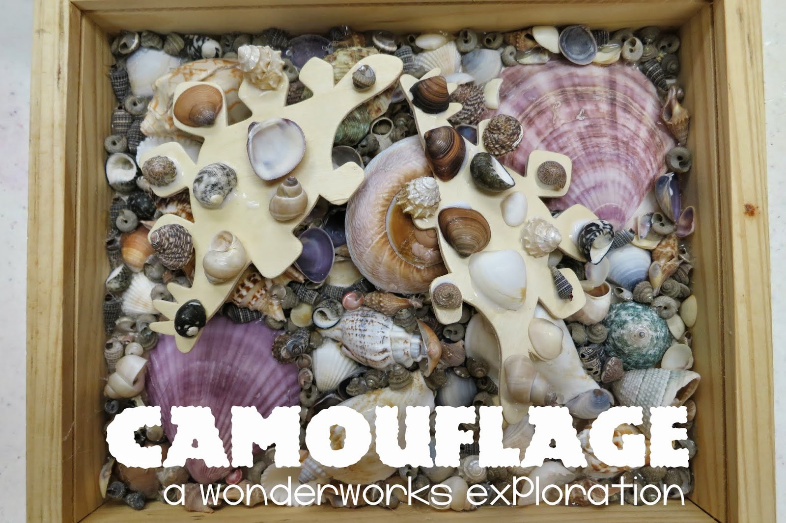 Once again, we've partnered with the UW Geology Museum and this week they loaned us a set of wooden shadow boxes, each filled with textures from different environments -- shells, stones, flowers/leaves (fake) and dried moss. They also gifted us some wooden animal shapes and extra bits and pieces from those texture boxes and invited the kids to disguise the animals and "hide" them in one of the environments.