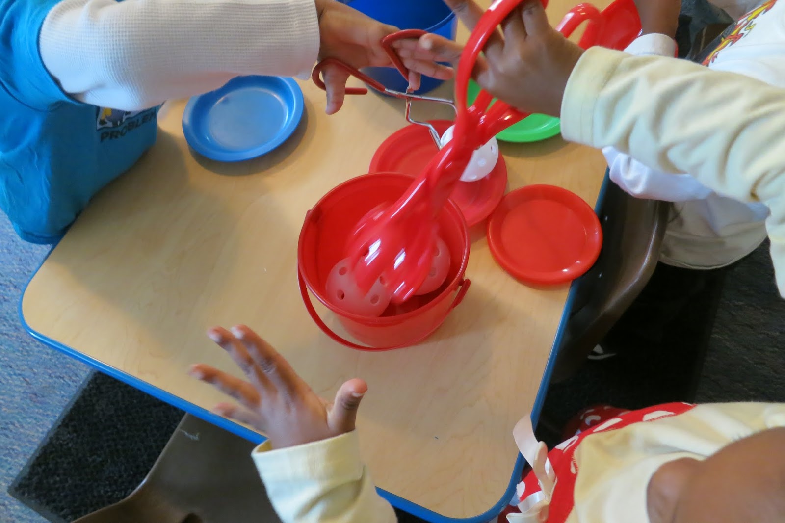 The large tongs (this scissor style that comes apart easily was hard to use. I don't recommend this style.) were used to pick up the wiffle balls and put them on small plates I found in the daycare center's play kitchen area.