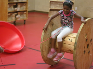 These girls started off with just pushing each other on the giant spools,